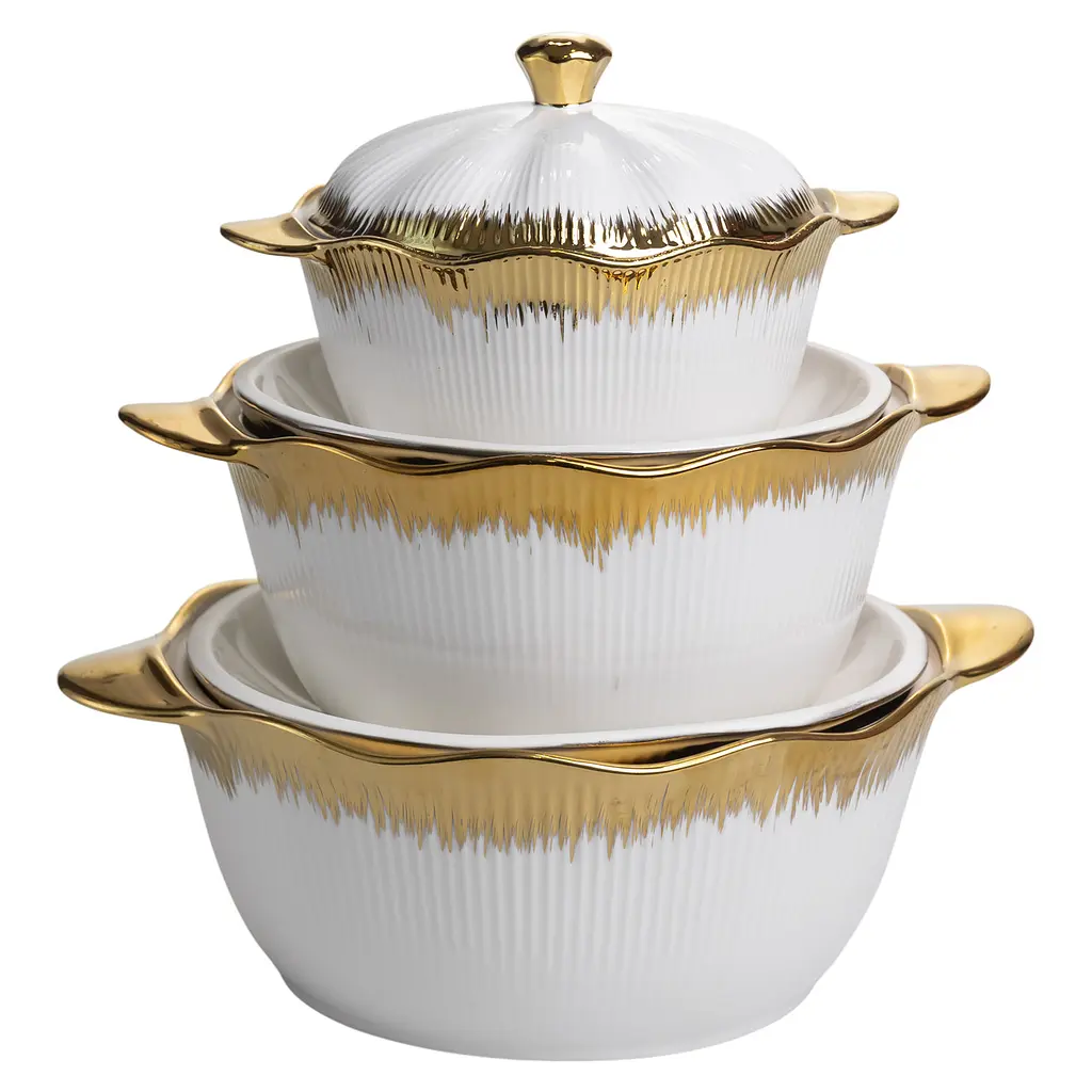 Этот роскошный набор супниц создан для тех, кто ценит не только вкус блюд, но и красоту их подачи. Белоснежный фарфор с глянцевым покрытием и эффектным золотым декором превращает каждое блюдо в настоящий шедевр.