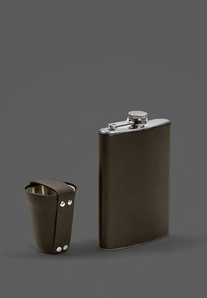 Набор состоит из фляги, обтянутой натуральной кожей, и четырех рюмок в кожаном чехле. Компактная фляжка может содержать минимальное количество алкоголя для компании близких друзей.