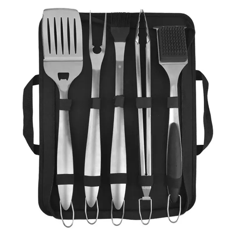 Все инструменты изготовлены из нержавеющей стали, что обеспечивает долговечность и простоту ухода. Рукоятки инструментов имеют металлические петли для подвешивания и удобного хранения на крючках возле гриля.