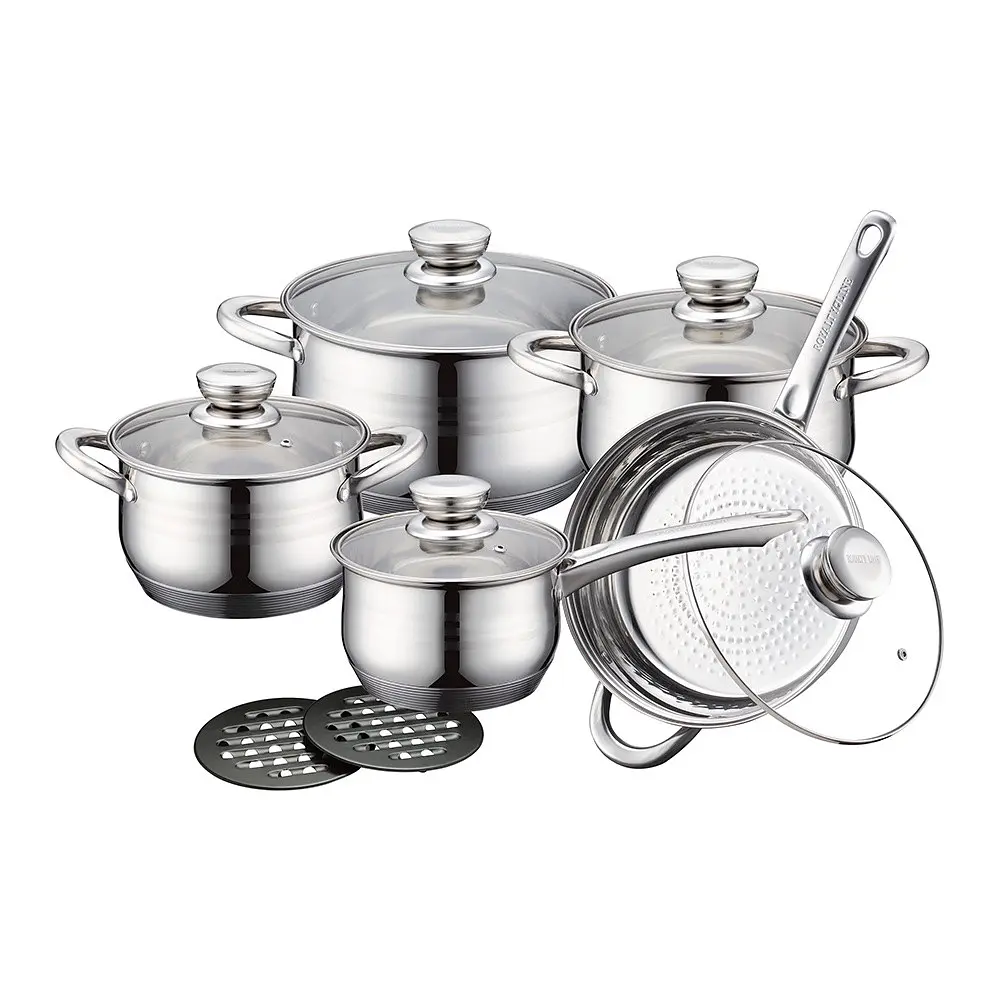 Набор посуды содержит 3 кастрюли разного размера, ковш, сковороду и 2 подставки под горячее, что позволяет готовить одновременно несколько блюд.