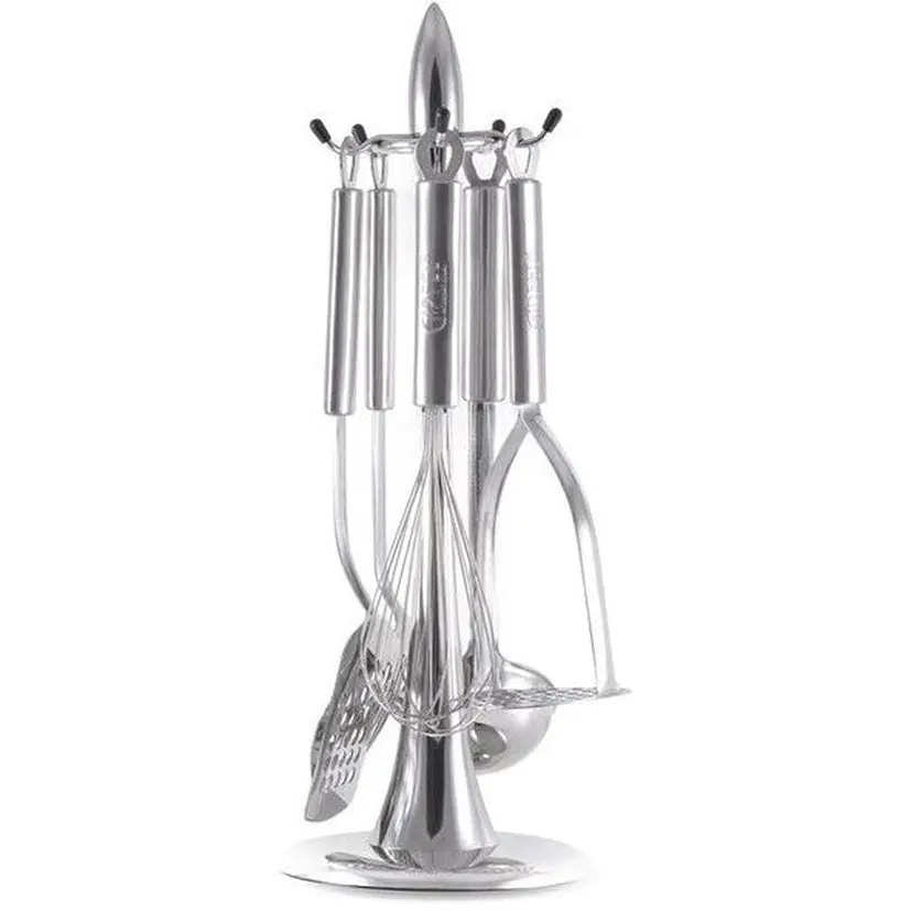 Набор кухонных инструментов на подставке состоит из 5 предметов на подставке: лопатки, шумовки, венчика, половника, пестика. Полностью изготовлен из нержавеющей стали высочайшего качества. Такую посуду можно смело мыть в посудомоечной машине и использовать при высоких температурах. Устойчивая подставка имеет оригинальный дизайн и с легкостью удерживает все предметы набора.