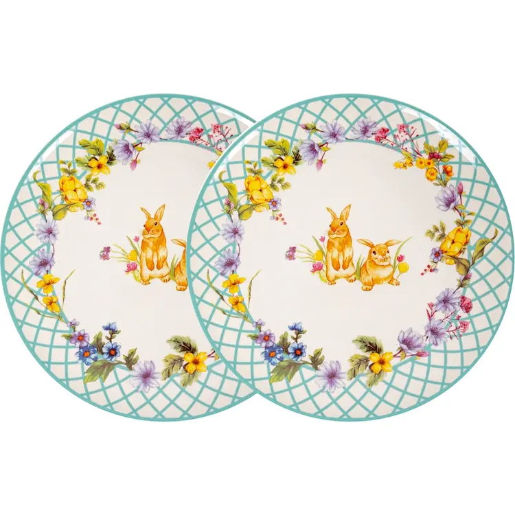 Набор тарелок Lefard Funny Bunny включает в себя две волшебные тарелки, идеально подходящие для весенней или пасхальной сервировки. Каждая тарелка украшена рисунком с забавными кроликами и яркими цветочными орнаментами, которые придают ей особый шарм и радость. Зеленовато-голубой узор по краю создает гармоничный контраст с центральным рисунком.