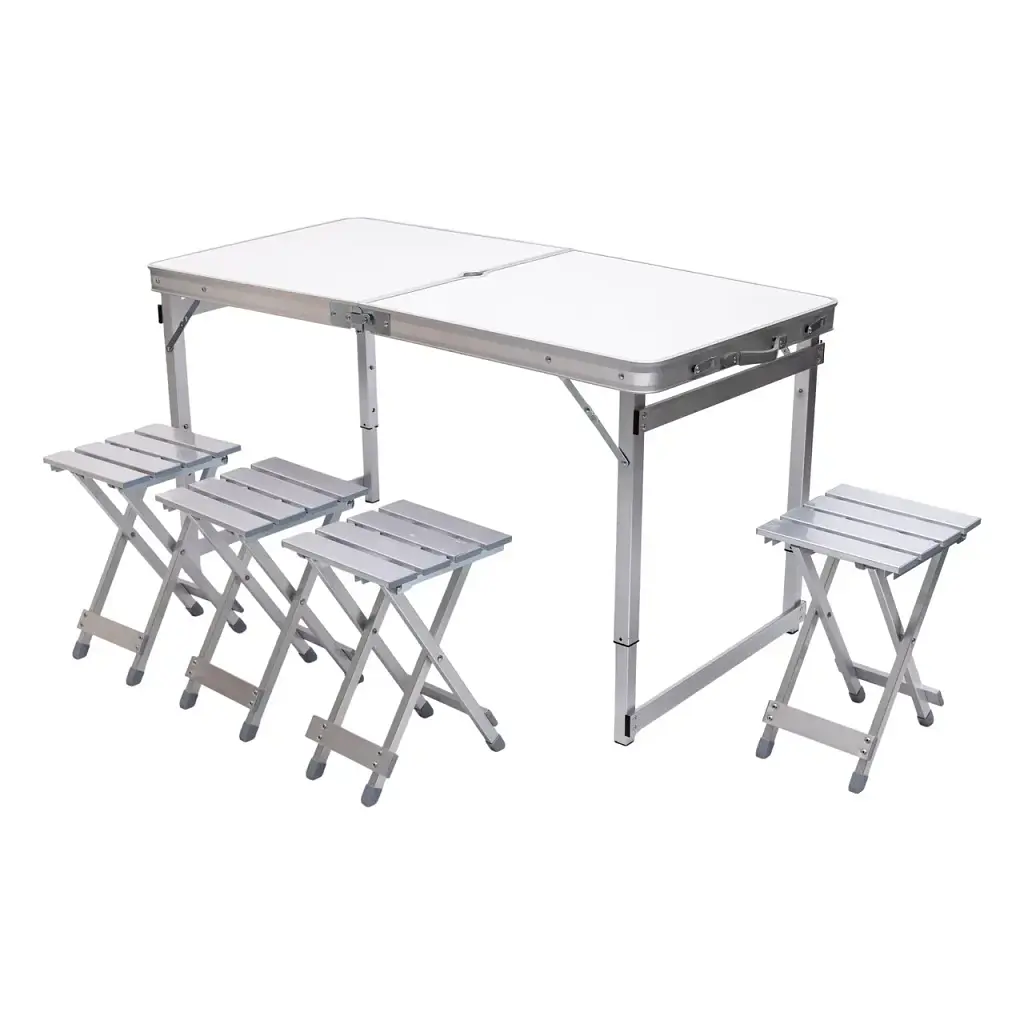 Комплект отличается компактностью: в сложенном виде он превращается в аккуратный чемодан с ручкой, который легко хранить дома или перевозить в багажнике автомобиля. Четыре складных стула идут в комплекте, они удобны в использовании и обеспечивают комфортное сидение даже при длительном отдыхе.