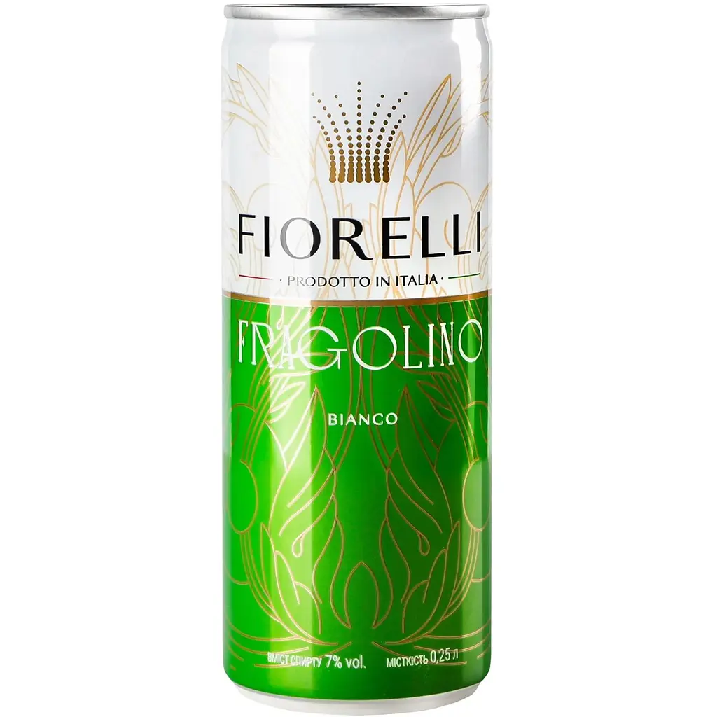 Напій винний Fiorelli Fragolino Bianco, біле, солодке, 7%, 0,25 л — це легкий ігристий напій на основі вина з регіону П’ємонт, Італія, виготовлений з винограду сорту Мускат Білий (Muscat Blanc) із додаванням натурального полуничного соку. Має світло-золотистий колір із ніжним перляжем. Аромат яскравий, солодкий, із виразними нотами полуниці, лісових ягід і легкими квітковими відтінками. Смак гармонійний, солодкий, з приємною фруктовою свіжістю та тривалим полуничним післясмаком. Чудовий як аперитив, ідеально поєднується з легкими десертами, фруктами, сухою випічкою або коктейлями, наприклад, із додаванням льоду. Рекомендується подавати охолодженим до 6–8°C. Компактний формат 0,25 л у жестяній банці зручний для пікніків чи вечірок. Доступна ціна (приблизно 199–275 грн залежно від магазину) робить його популярним вибором для любителів солодких ігристих напоїв.