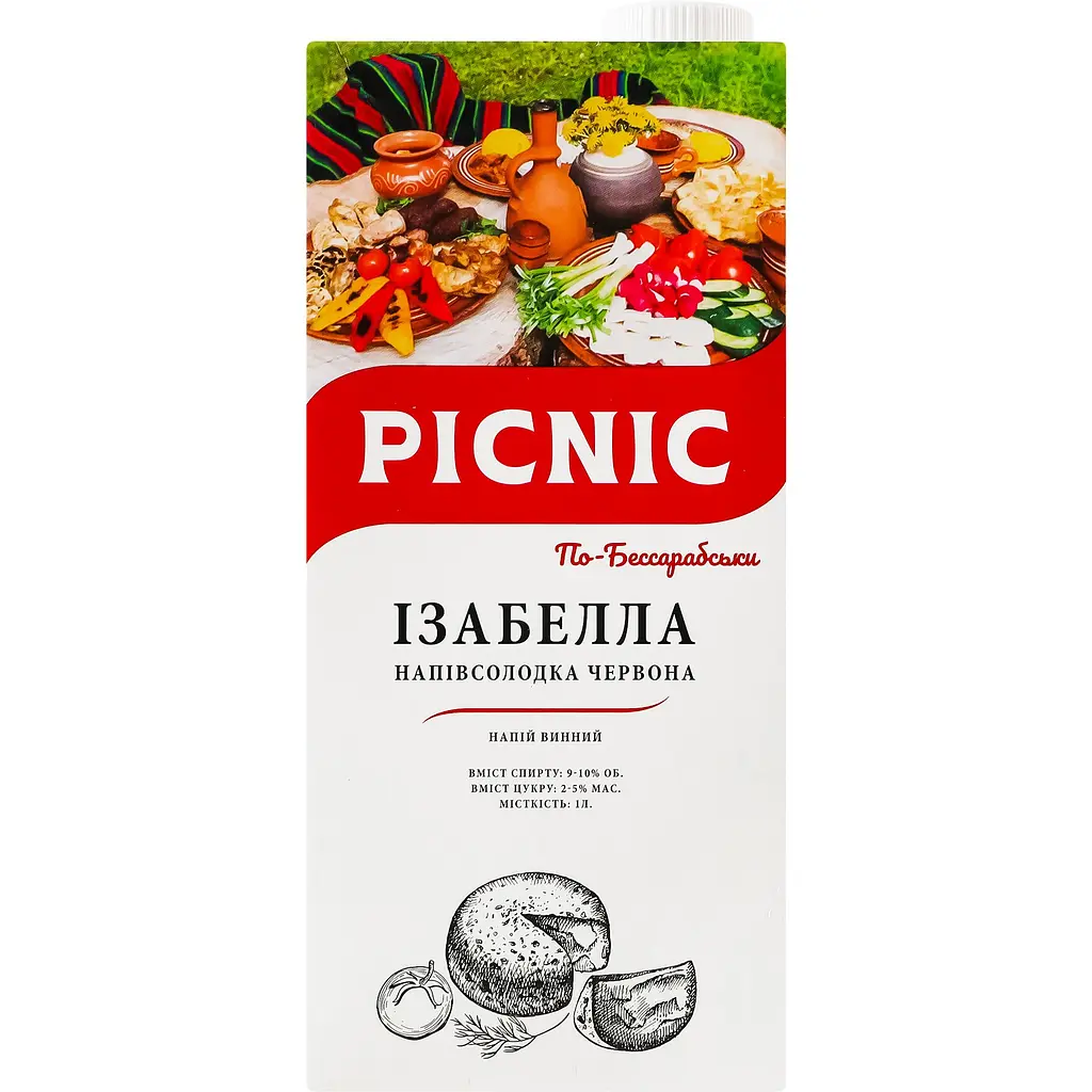 Вино Picnic имеет яркий сочный вкус с выраженными ягодными нотками, типичными для сорта Изабелла. В вкусовой гамме доминируют клубника, ежевика, черная смородина и вишня, дополненные легкой карамелевой сладостью. Цвет напитка - насыщенный рубиново-вишневый с фиолетовым оттенком, что указывает на молодость и фруктовость. Аромат интенсивный, узнаваемый - с характерными оттенками земляники, листьев черной смородины и легкого виноградного мускуса. Послевкусие долгое, фруктово-сладкое, с мягким, округлым завершением.