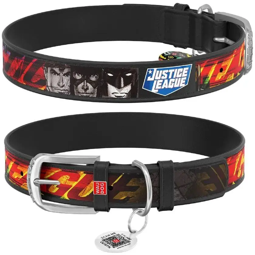Ошейник для собак Waudog Design кожаный с QR паспортом, рисунок Лига Справедливости, M, Ш 20 мм, Дл 29-38 см (4823089323053)