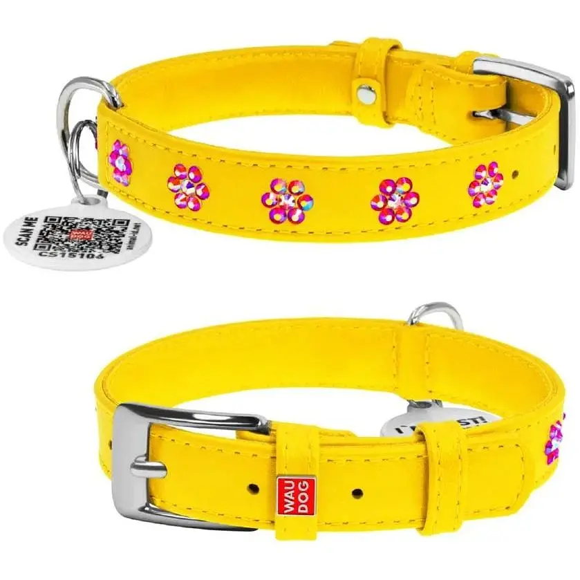 Ошейник для собак Waudog Glamour кожаный с QR паспортом, с клеевыми стразами Цветочек, XS, Ш 15 мм, Дл 27-36 см (2032848000001)