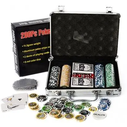 Выглядит набор очень эффектно, сделан он по подобию взрослых профессиональных комплектов. Здесь есть два бревна карт, 200 фишек, пять кубиков. Все это упаковано в чемоданчик. Поставляется в коробке размером 30х8х20 сантиметров.