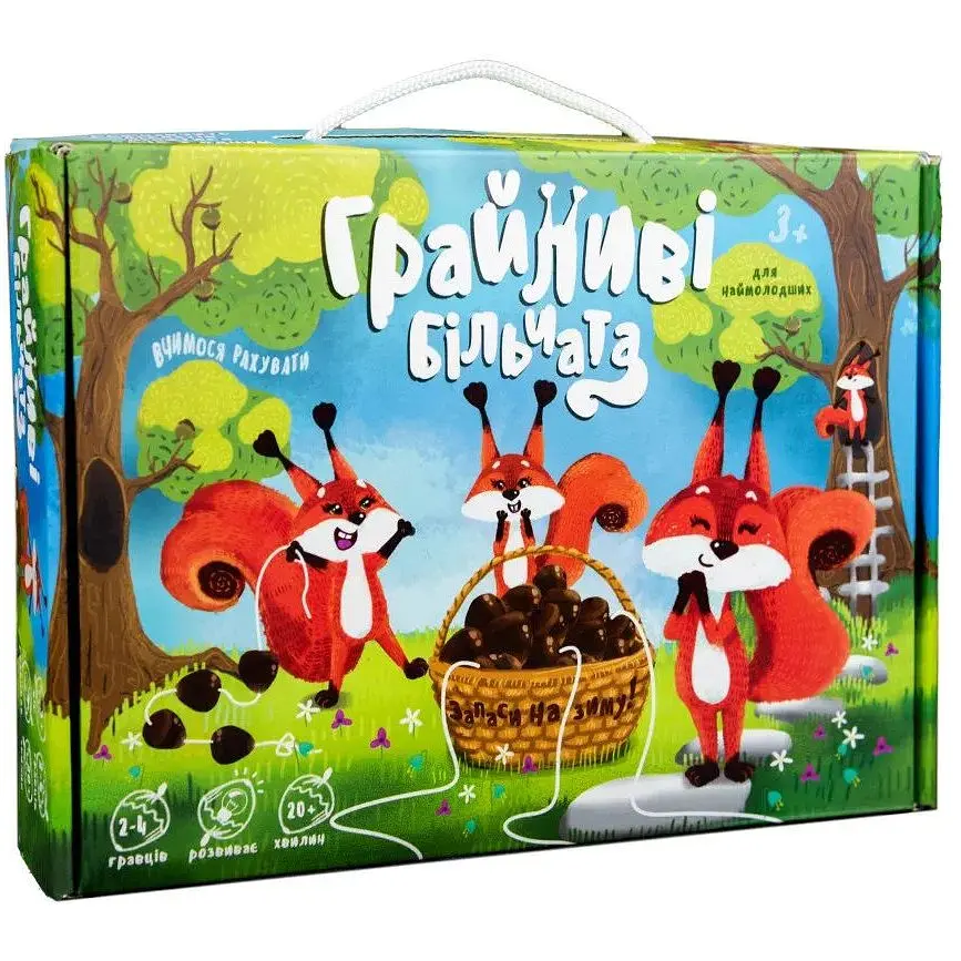 Настольная игра Strateg Игривые бельчатые на украинском языке – это игра, которая учит считать, быть внимательным, усидчивым и добрым, ведь в конце игроки смогут разделить орешки поровну между собой, чтобы всем хватило запасов на зиму. А бусины, нанизанные на ниточку, становятся отличным способом для развития мелкой моторики рук. Каждый игрок имеет свою дорожку, ведущую в корзину с орешками. И цель игры собрать как можно больше орешков, нанизывая их на свою ниточку. Но дорожка так непредсказуема: здесь ты собрал 3 орешка, а здесь тебе нужно поделиться с другом. Выигрывает тот, кто собрал самый большой запас орешков. "Игривые бельчатые" - это лучшая игра для младшего дошкольного развития. Рекомендуемый возраст: 8+. Количество игроков: 2-4. Комплектация игры: 24 шт. картонных карточек, 28 деревянных бусин, 4 тканевые канатики, 1 картонная корзина, бумажная инструкция. Размер упаковки: 27,7х18,3х5,8 см.