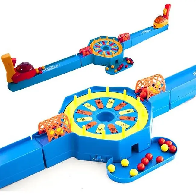 Вы не знаете, чем заинтересовать ребенка? Покупайте настольную игру Стреляющие шарики, она поможет решить вам вашу проблему. Эта настольная игра состоит из круглого поля, стреляющих ядер, шариков и корзины. В нее можно играть как одному, так и в паре. В наборе настольной игры есть красные и желтые шарики. Каждый игрок может выбрать для себя определенный цвет и занять понравившуюся ему сторону. Перед началом игры, засыпьте каждое ядро шариками. Основную задачу этой игры сбить как можно больше мишеней противника и оставить без внимания свои. На основном поле размещена кнопочка включения и выключения, позволяющая полю крутиться, как карусели. По обе стороны поля есть препятствия, которые поднимаются и опускаются, мешают мячикам попадать по мишеням. Как только вы сбиваете мишень противника, вам начисляются баллы. Карусель может двигаться и издавать звуковые эффекты. Работает она с помощью батареек. Такая игра помогает ребенку развивать мелкую моторику, ловкость пальчиков и кисти, внимательность, реакцию и сосредоточенность. Игра изготовлена из пластика, рекомендована для игры детям старше 6 лет. В комплекте входят: основное поле; ядра; шарики; корзина.