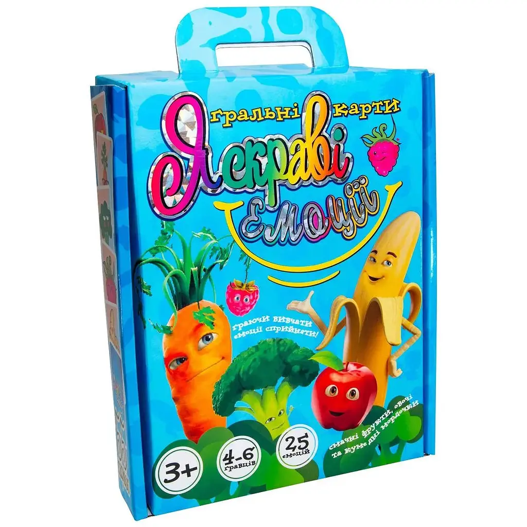 Веселое развлечение для компании - настольная игра Яркие эмоции. Заинтересует не только детей, но и взрослых, позволит интересно провести время всей семье и при этом развить навыки общения и психологии. Также игра поможет развить и проявить эмоции детей, влияющих на поведение ребенка в будущем. В наличии 55 игровых карт с изображениями разных забавных овощей и ситуаций, которые с ними происходят. На карточках изображены разные эмоции персонажей. Суть игры – определить эмоцию, продемонстрированную другим игроком. Ответ можно выразить словами или действиями и показать соответствующую карточку. Побеждает тот, кто наберет максимальное количество очков. В процессе игры можно обсуждать и дополнять действия по уточнению ответа. В инструкции приведены правила и как определить победителя. Карты сделаны из картона.