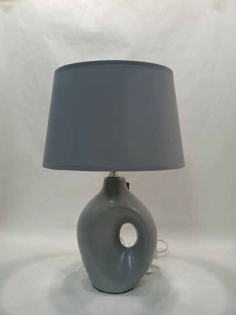 Размеры: длина - 250 мм, ширина - 180мм, высота - 390мм. Материал: керамический каркас серого цвета и серый текстильный абажур. Цоколь E14: поддерживает лампу до 40 Вт. Стильный и универсальный дизайн, подходящий для любого интерьера.