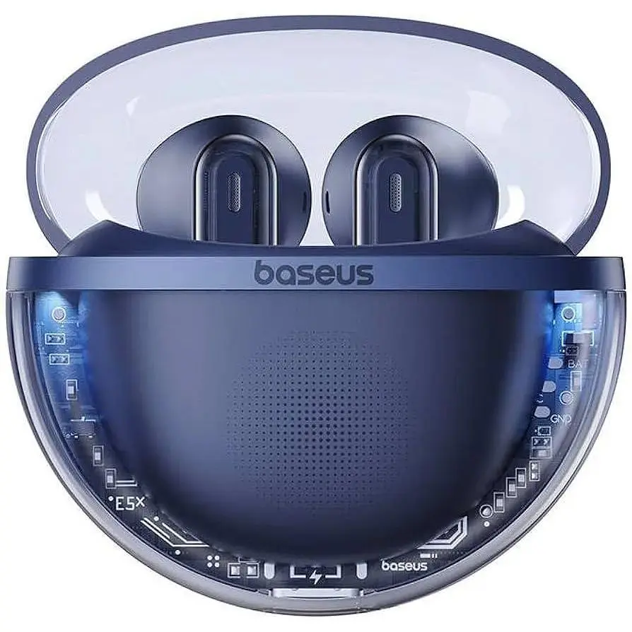 Bluetooth-наушники с микрофоном Baseus Bowie E5x TWS - это наушники с современным дизайном, который достигается за счет конструкции, использующей прозрачный купол для демонстрации внутренней электроники, выглядящей так, как будто карман наушников левитирует внутри. Сами наушники также имеют прозрачный купол, под которым находится гладкая ультратонкая диафрагма из полиуретана PEEK с синим цветовым акцентом. Синяя подсветка, встроенная в чехол, завершает стильный образ и помогает найти чехол ночью и разместить наушники в соответствующих отделениях.