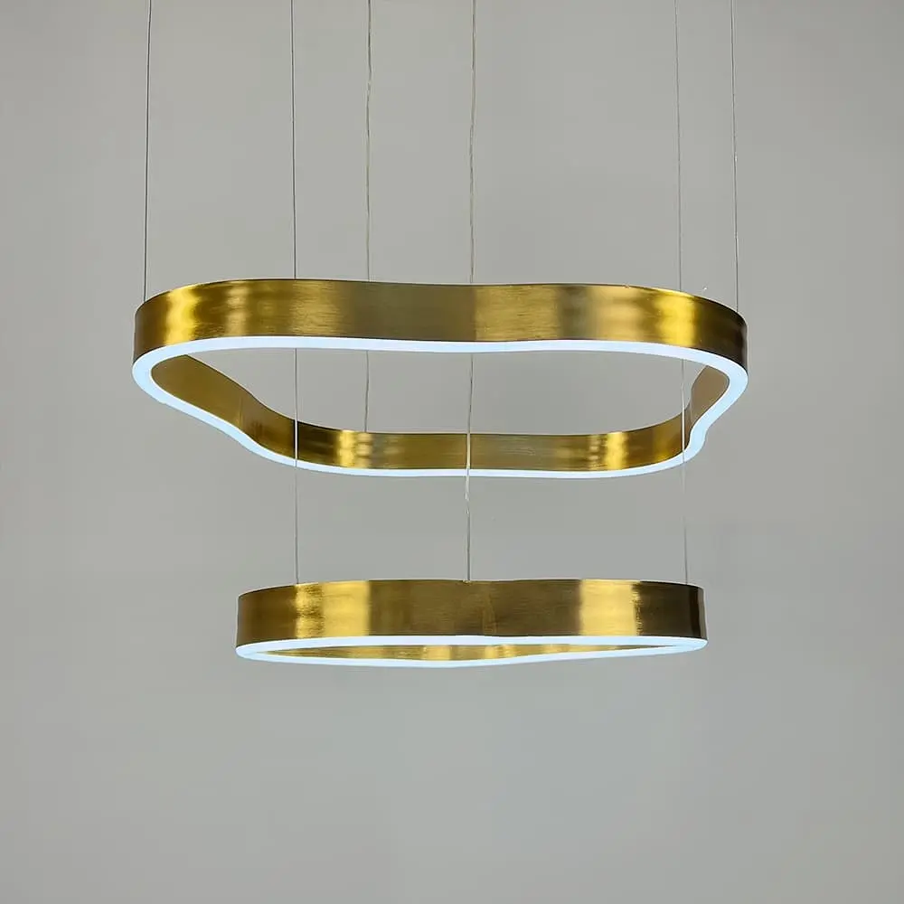 Необычная и эффектная, эта подвесная люстра поражает своим современным дизайном и гармонично сочетает в себе инновации и эстетику. Ее органичные, плавные формы как будто вдохновлены природой - волнообразные линии каждого яруса создают мягкий, воздушный силуэт. В сочетании с элегантным металлическим корпусом люстра становится настоящим арт-объектом в любом пространстве. Люстра представлена в 2-х цветах корпуса (золотой и черный) и в 3-х конфигурациях: 2 яруса: 60 + 40 см, мощность 54 Вт (26 Вт теплый/холодный свет + 4 Вт ночник) 3 яруса (общий Ø 80 см): 60х62 + 49х51 + 41х31 см, мощность 78 Вт (38 Вт теплый/холодный свет + 8 Вт ночник) 5 ярусов (общий Ø 120 см): 31х41, 51х56, 63х65, 81х75 и 97х93, мощность 125 Вт (60 Вт теплый/холодный свет + 11 Вт ночник) В нижней части каждого кольца встроена LED-подсветка с силиконовым рассеивателем. Доступны три режима света - теплый, холодный и нейтральный - а также режим ночника. Крепление на тросах позволяет регулировать высоту каждого элемента отдельно, создавая собственную уникальную световую композицию. Эта модель идеально подходит для просторных гостиных, столовых, холлов, бутиков или публичных зон, где нужен выразительный световой акцент и ощущение пространства. Тип цоколя: 60 Тип помещения: Люстры для гостиной (в зал) Режим ночника: Есть Форма изделия: Асимметричная Серия: PCL004 Цвет основания: Золотой Материал плафона: Силикон Размер потолочного основания: 25х4х5 см Цветовая температура: 3000–4500–6000К Максимальная высота: 180 см Минимальная высота: 50 см Материал основания: Металл Размер монтажной планки: 22 см Тип крепления: Монтажная планка Мощность (Вт): 54