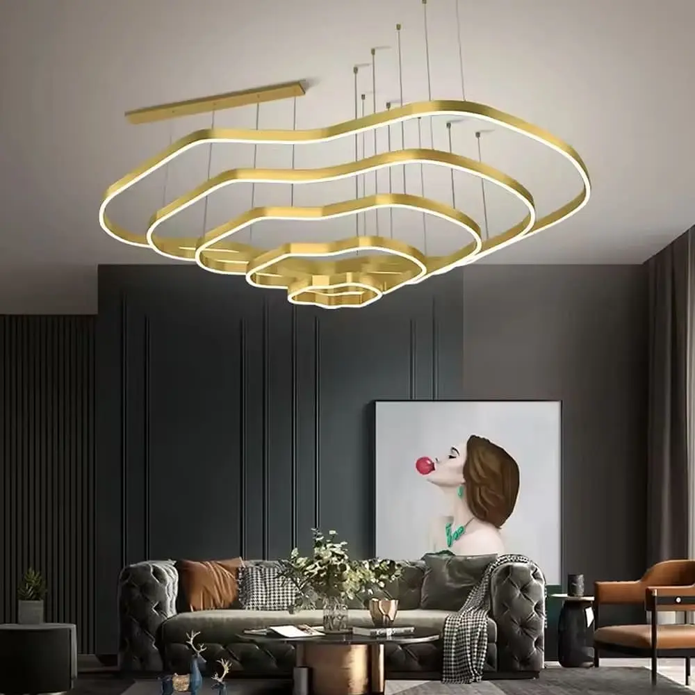 Необычная и эффектная эта подвесная люстра поражает своим современным дизайном и гармонично сочетает в себе инновации и эстетику. Ее органические, плавные формы вдохновлены природой - волнообразные линии каждого яруса создают мягкий, воздушный силуэт. В сочетании с элегантным металлическим корпусом люстра становится настоящим арт-объектом в любом пространстве. Люстра представлена в 2-х цветах корпуса (золотой и черный) и в 3-х конфигурациях: 2 яруса: 60 + 40 см, мощность 54 Вт (26 Вт теплый/холодный свет + 4 Вт ночник) 3 яруса (общий Ø 80 см2) + 40 мощность 78 Вт (38 Вт теплый/холодный свет + 8 Вт ночник) 5 ярусов (общий Ø 120 см): 31х41, 51х56, 63х65, 81х75 и 97х93, мощность 125 Вт кольца встроенная LED-подсветка с силиконовым рассеивателем. Доступны три режима света - теплый, холодный и нейтральный - а также режим ночника. Крепление на тросах позволяет регулировать высоту каждого элемента в отдельности, создавая собственную уникальную световую композицию. Эта модель идеально подходит для просторных гостиных, столовых, холлов, бутиков или публичных зон, где требуется выразительный световой акцент и чувство пространства. Цвет плафона: 97 Тип помещения: Люстры для гостиной (в зал) Режим ночника: Есть Форма_изделия: Асимметричная Серия: PCL004 Цвет основания: Золотой Материал плафона: Силикон Размер потолочного основания: 65х4х7 см Цветовая температура: 0000-0000 165 см Минимальная высота: 40 см Тип цоколя: LED-модуль Материал основания: Металл Размер монтажной планки: 33 см Тип крепления: Монтажная планка + 10 тросов Мощность (Вт): 125