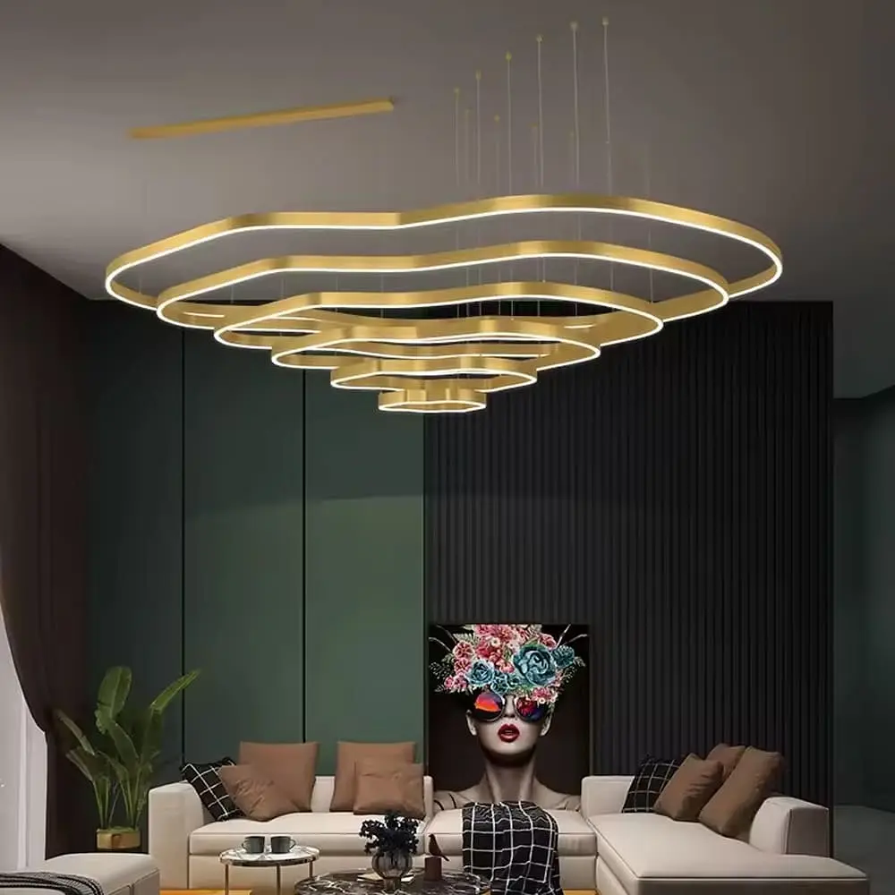 Необычная и эффектная эта подвесная люстра поражает своим современным дизайном и гармонично сочетает в себе инновации и эстетику. Ее органические, плавные формы вдохновлены природой - волнообразные линии каждого кольца создают мягкий, воздушный силуэт. В сочетании с элегантным металлическим корпусом люстра становится настоящим арт-объектом в любом пространстве. Люстра представлена в 2-х цветах корпуса (золотой и черный) и в 3-х конфигурациях: 2 яруса (общий Ø 60 см): : 65х55 см и 45х30 см, мощность 54 Вт (26 Вт теплый/холодный свет + 4 Вт ночник) 0 85х74, 64х55 и 40х33 см, мощность 76 Вт (38 Вт теплый/холодный свет + 8 Вт ночник) 5 ярусов (общий Ø 120 см): 33x43, 57x64, 74x84, 90x91 и 10 Вт теплый/холодный свет + 11 Вт ночник) В нижней части каждого кольца встроена LED-подсветка с силиконовым рассеивателем. Доступны три режима света - теплый, холодный и нейтральный - а также режим ночника. Крепление на тросах позволяет регулировать высоту каждого элемента в отдельности, создавая собственную уникальную световую композицию. Эта модель идеально подходит для просторных гостиных, столовых, холлов, бутиков или публичных зон, где требуется выразительный световой акцент и чувство пространства. Тип цоколя: 120 Тип помещения: Люстры для гостиной (в зал) Режим ночника: Есть Форма_изделия: Асимметричная Серия: PCL006 Цвет основания: Золотой Материал плафона: Силикон Размер потолочного основания: 65х4х7 см Цветовая температура: 0000-000 165 см Минимальная высота: 40 см Материал основания: Металл Размер монтажной планки: 33 см Тип крепления: Монтажная планка + 10 тросов Мощность (Вт): 125