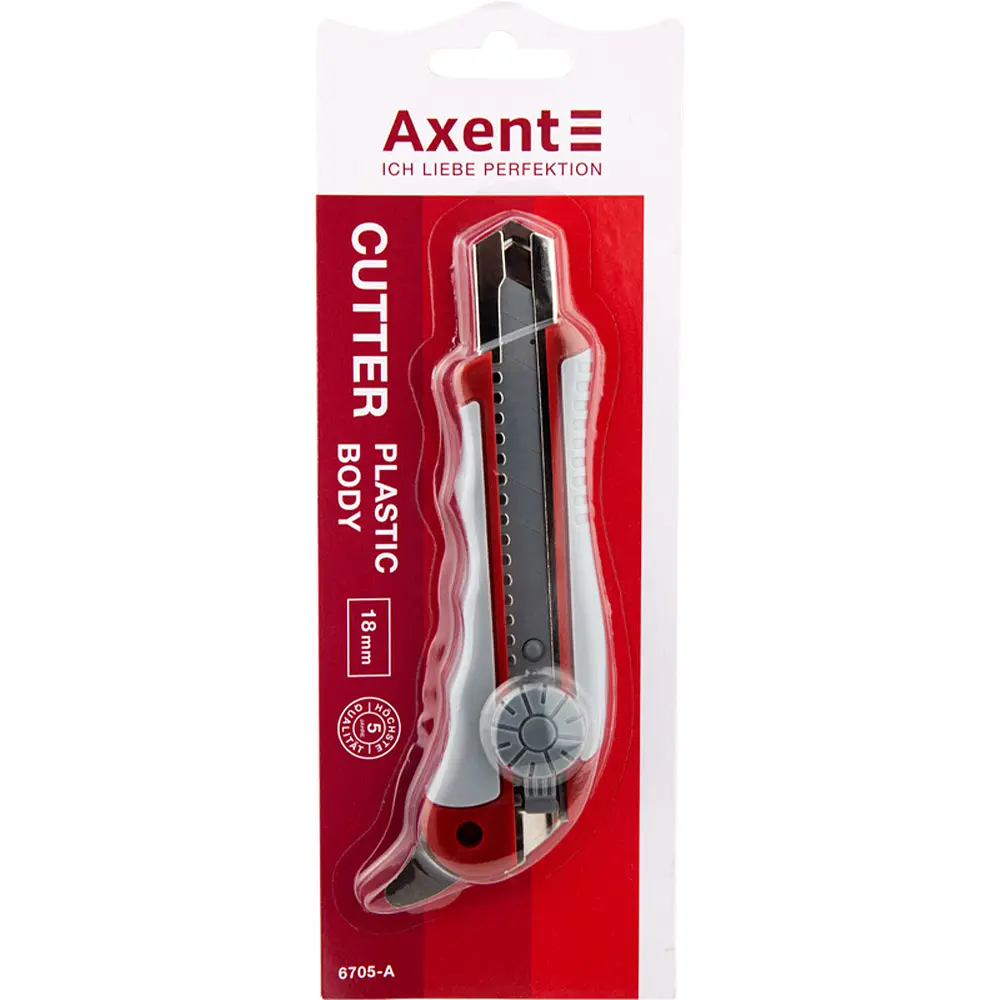 Нож канцелярский Axent изготовлен из прочного пластика с резиновыми вставками. Фиксация лезвия Twist-Lock (колесиком). Блистерная упаковка.