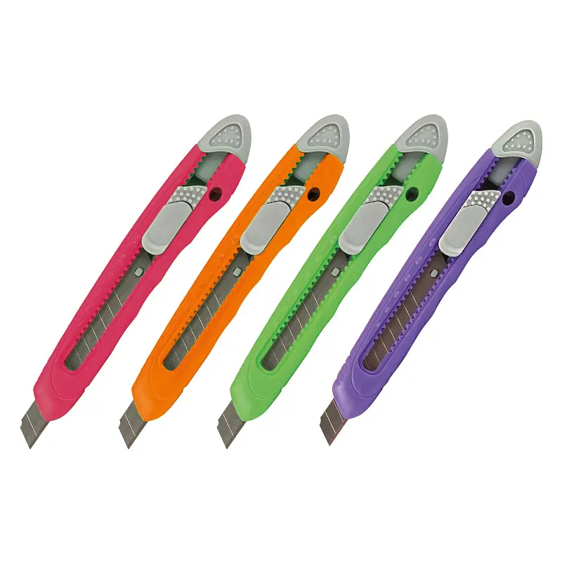 Крышка с пазом позволяет просто и безопасно обломать затупленную часть лезвия вдоль линии насечки и продолжать пользоваться острым лезвием. Нож имеет отверстие в рукоятке для шнурка. Благодаря эргономичному корпусу нож удобно держать в руке. Еще одна приятная особенность – яркий цвет корпуса, что необычно для таких инструментов.