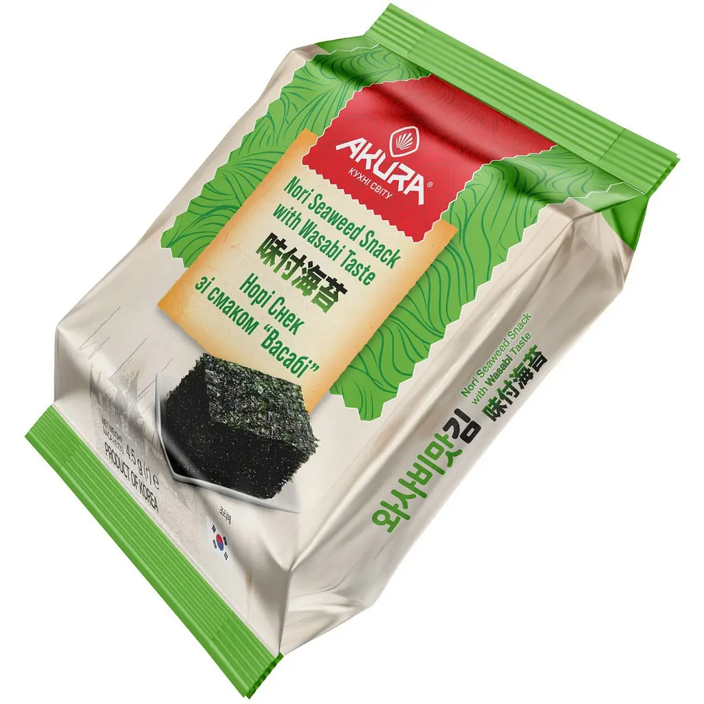 Нори снек Akura со вкусом васаби - вкусная закуска без красителей и консервантов.