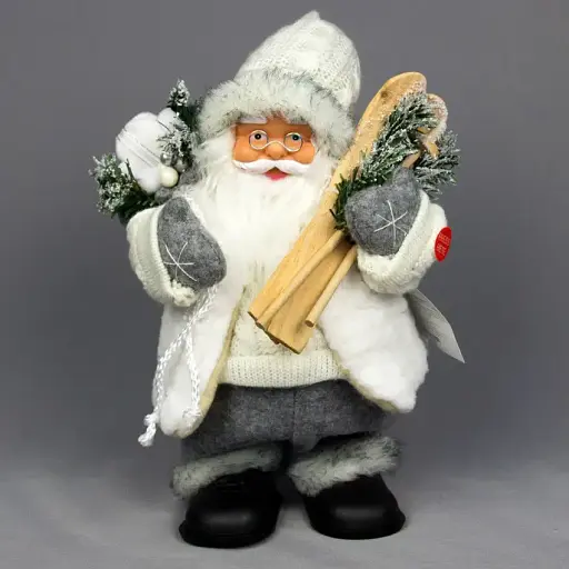 Новогодняя фигурка Devilon Дед Мороз в белой вязаной одежде с подарками и лыжами - это стильное и волшебное украшение, которое наполнит дом праздничным настроением и зимней атмосферой. Изготовленная с заботой о деталях, эта фигурка сочетает традиционный образ зимнего волшебника с элементами зимних развлечений, ведь в руках Дед Мороз держит лыжи и мешок подарков - будто только что прибыл из зимнего леса к вашей елке.