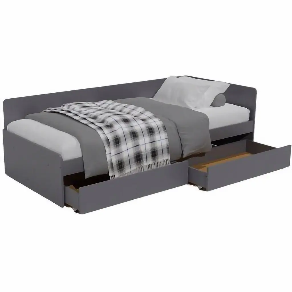 Подойдет для обустройства комфортного спального места в небольшой спальне или детской комнате. Надежная конструкция имеет высокое изголовье с округлыми краями. Комплектуется щитом с усиленными ребрами жесткости как основание. Кровать оснащена двумя выдвижными ящиками для постельного белья, игрушек, одеяла и подушек. Дополнительно можно приобрести небольшую прикроватную тумбу из этой же серии.