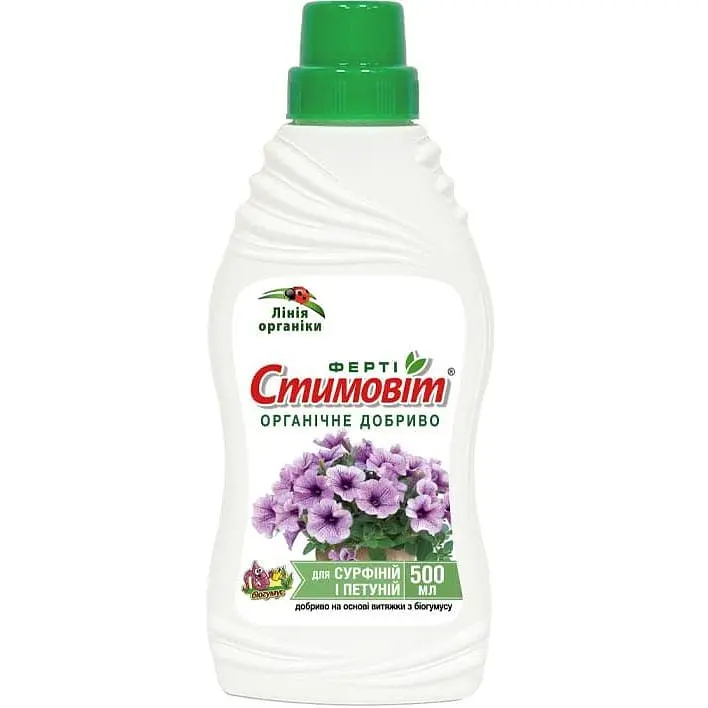 Органо-минеральное удобрение Для сурфиний и петуний Стимовит 0.5 литров можно использовать и в качестве корневой, и в качестве внекорневой подкормки. Комплексное удобрение обеспечит вашим растениям высокий уровень иммунитета, активное и длительное цветение, а низкие нормы расхода и относительно невысокая цена принадлежит явным преимуществам препарата.