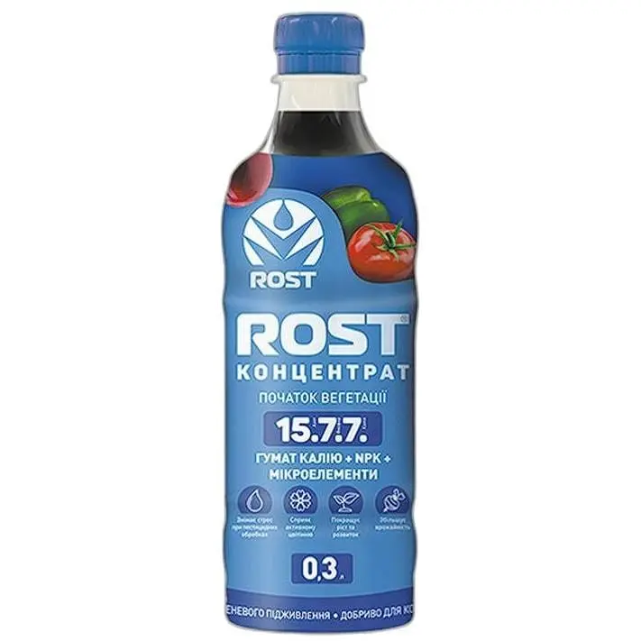 Органо-минеральное удобрение Rost Концентрат- это органо-минеральное удобрение на основе концентрированного гумата калия. Содержит комплекс макро-, мезо- и микроэлементов. Оно снабжает растения необходимыми элементами питания; мобилизует иммунную систему растений; улучшает синтез сахаров, аминокислот, витаминов в растении; усиливает поглощение воды и кислорода, в результате ускоряет распределение клеток; интенсифицирует обменные процессы; повышает поступление питательных элементов в растение; ускоряет синтез нуклеиновых кислот и белка; активирует белковый и углеводный обмен веществ; увеличивает проницаемость клеточной мембраны; облегчает транспортировку питательных веществ внутрь клетки.
