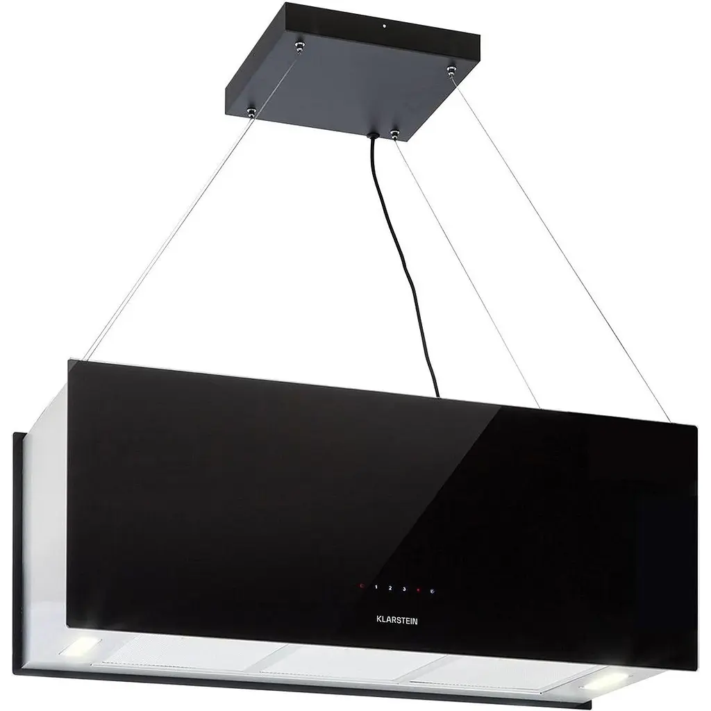 Внешний вид островной вытяжки Klarstein Chandelier XL также отличается изысканным дизайном Pure Ambience . Передняя и задняя части сияют роскошным черным защитным стеклом, а боковины отделаны матовой нержавеющей сталью.