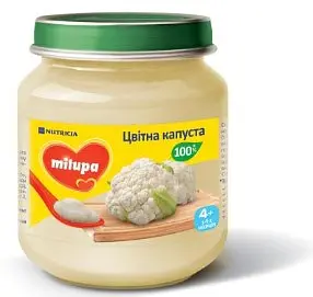 Пюре Milupa з цвітної капусти — ніжне і смачне, ідеально підходить для першого прикорму. Добре засвоюється, має натуральний склад без зайвих добавок. Малюк їсть із задоволенням!