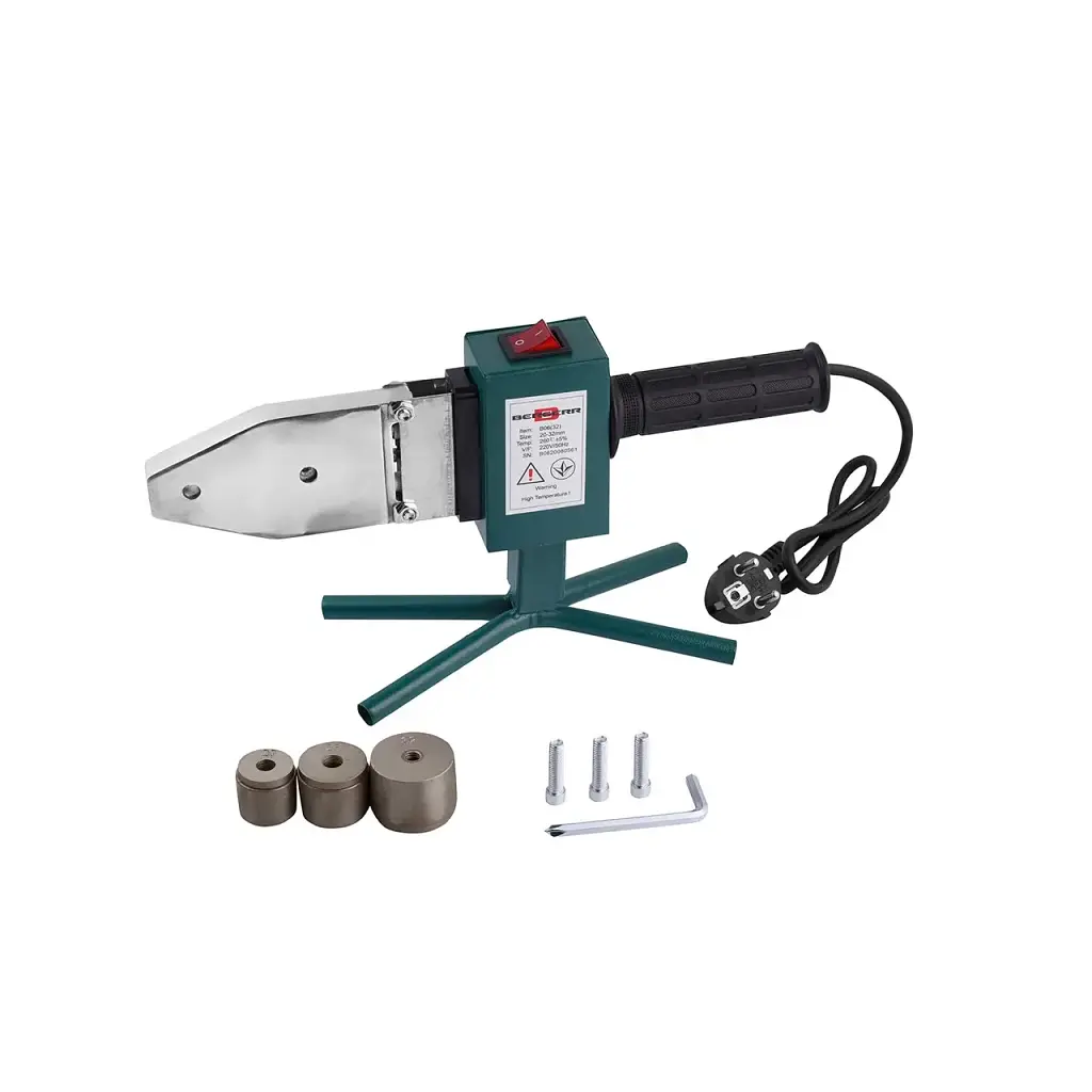 Паяльник для пластиковых труб BERGERR B06 800 Вт применяется для монтажа систем водоснабжения и отопления. 3 комплекта сменных насадок с антипригарным покрытием, обладающих равномерной и стабильной теплопроводностью. Могут использоваться для плавления труб из PP / PPR / PE и других пластиковых материалов с целью получения бесшовной сварки. Диаметр 20 – 63 мм. Работает от бытовой электросети переменного тока, его нагревательный элемент рассчитан на напряжение 220 В, 50 Гц. Мощность нагревательного элемента составляет 800 Вт, ручная регулировка температуры от 0 до 300 °C, можно установить температуру, необходимую для сварки различных материалов.