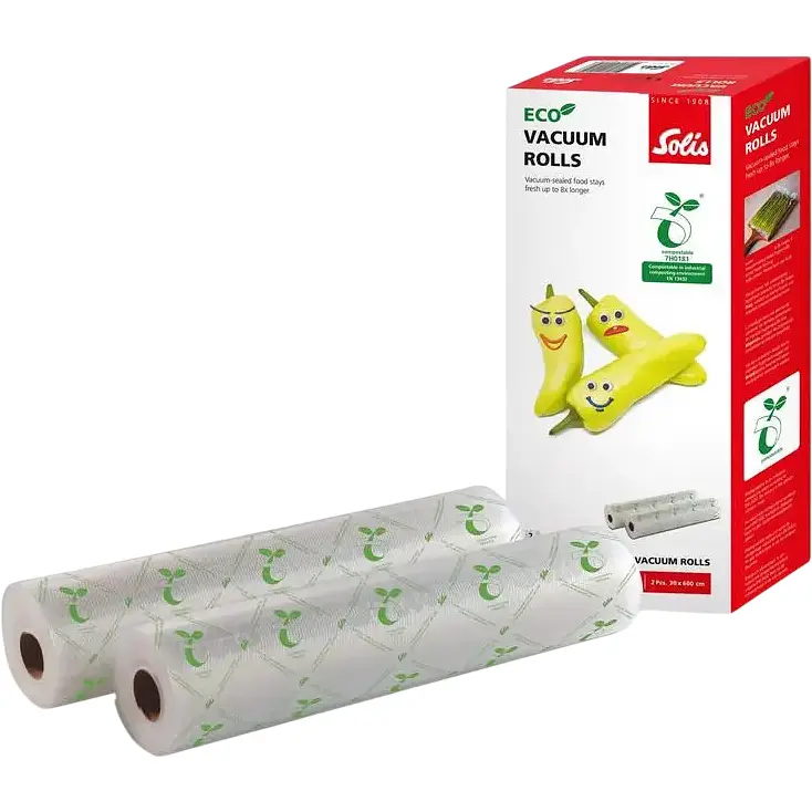 Пакеты-рулоны для вакууматора Solis ECO Rolls 30x600 см (92300) помогают сохранять свежесть продуктов до 8 раз дольше. Таким образом, вы не только уменьшаете пищевые отходы, но одновременно экономите деньги. Еще одним важным преимуществом вакуумной упаковки продуктов является их свойство сохранять аромат: вакуумная упаковка сохраняет все вкусы и одновременно защищает пищу от нежелательных запахов. Они идеально подходят для ежедневного использования дома, а также для приготовления по технологии со-вид.