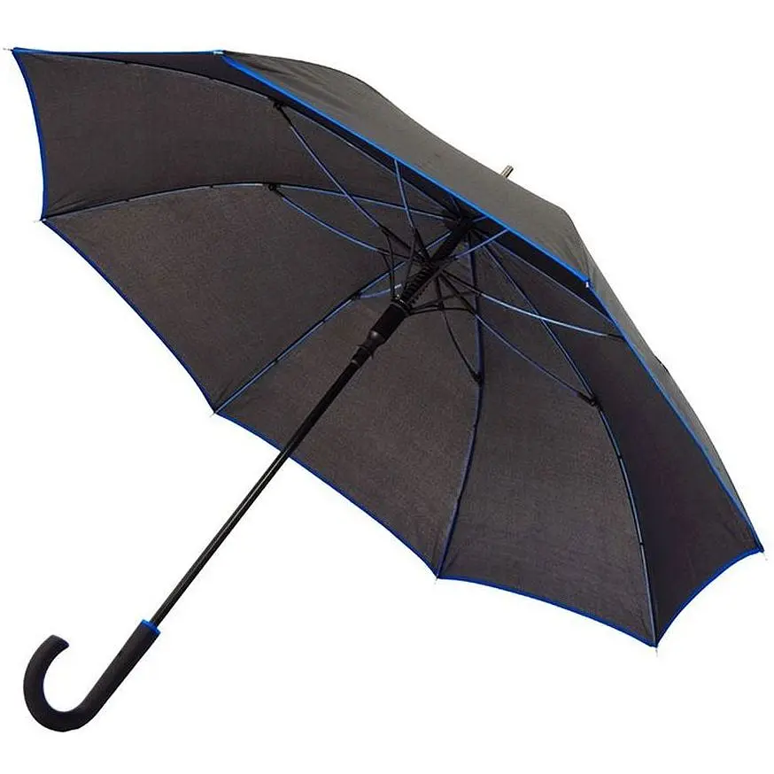 Зонт-трость имеет сплошное основание без телескопического устройства. На стержне (основе) закреплены мощные спицы из стекловолокна, они имеют контрастный цвет. На каркас из спиц натянут купол из водонепроницаемой ткани эпонж 190Т.