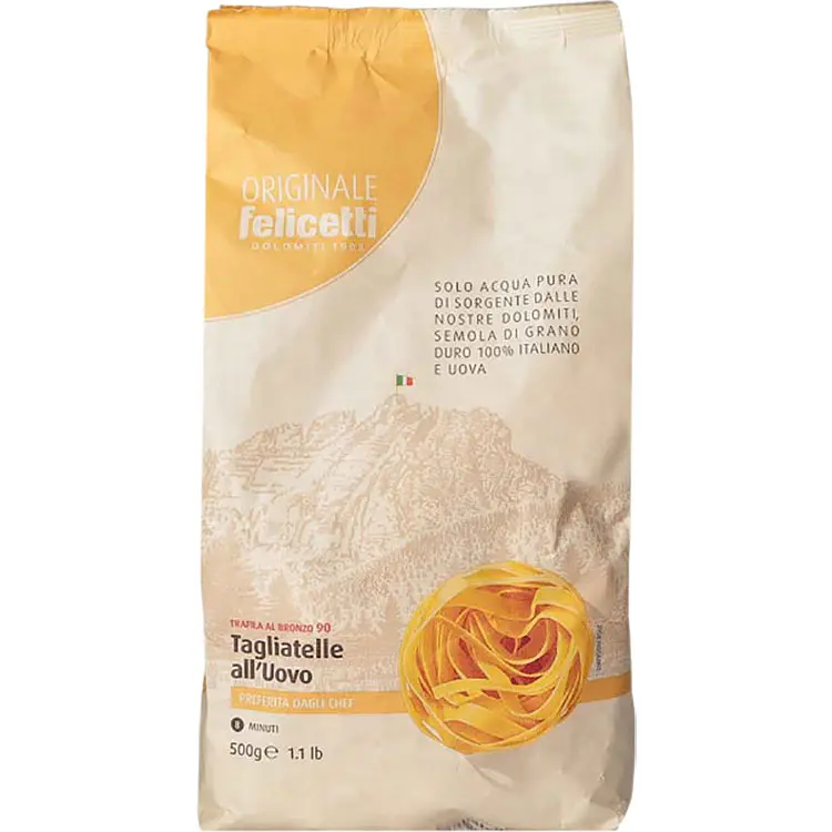 Паста Felicetti Тальятелле Аль'Уово - традиционная итальянская фигурная паста, создана на основе муки из твердых сортов пшеницы. Имеет тонкую поверхность, обладает нежным золотистым цветом и мягким вкусом.