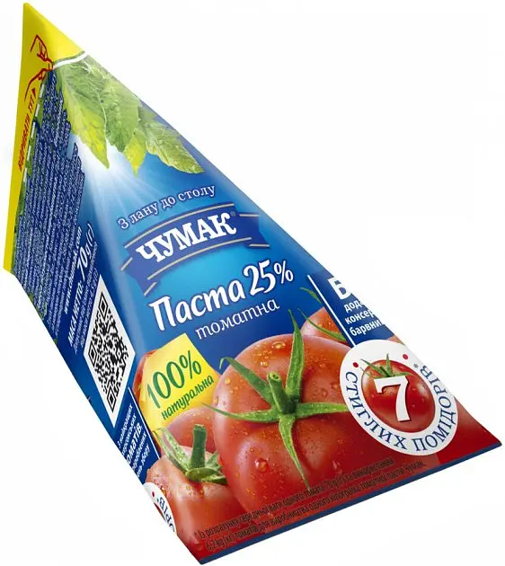 Паста томатная Чумак обьемом 70 г или "Томатная пирамидка" - одна из самых популярных упаковок томатной пасты в Украине, поскольку является оптимальной одноразовой порцией томатной пасты для многих украинских блюд. Используется для домашнего потребления в несколько раз. Кроме того, ее концентрированный, почти мясистый вкус добавляет изюминку ко всему, что вы готовите: от соуса для макарон до тушеных овощей и мяса.