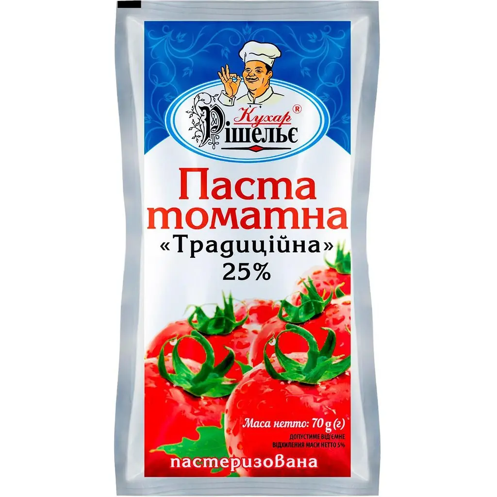 Томатная паста Кухар Рішельє Традиційна - это продукт, изготовленный из спелых красных помидоров высокого качества с добавлением поваренной соли для улучшения вкуса. Паста содержит 25% сухих веществ и отличается насыщенным томатным вкусом и ароматом. Она идеально подходит для приготовления соусов, супов и различных блюд, где нужен яркий томатный вкус.