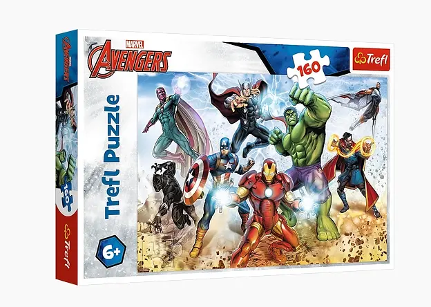 Пазл из 160 деталей с изображением Мстителей из мультфильма Марвел. После сборки картинка будет 410х278мм. Высокое качество, насыщенность цвета и безопасная сборка обеспечивается каландровой светоотражающей бумагой и использованием экологически чистых материалов.