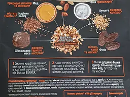 Корисний склад продукту: хрусткі випечені цільнозернові вівсяні пластівці, арахіс, насіння льону та кунжуту, фініки, какао та мед. Вигідніше за ціною брати не печиво гранолу (110 г), а просто гранолу (300 г) цього ж виробника та заливати рідиною. Печиво нібито зручніше в дорозі, але на пакуванні немає зіп-застібки.