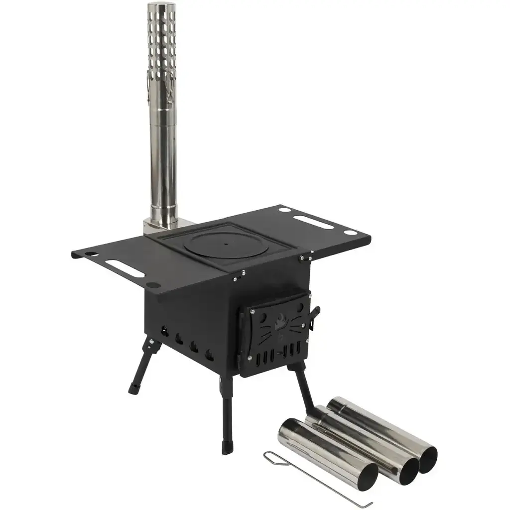 Печь изготовлена из жаростойкой стали и имеет секционный дымоход с искрогасителем, который предотвращает распространение искр. Это позволяет устанавливать печь под тентом, на террасе или беседке, или даже на входе в палатку, оставив дымоход снаружи. В дверце находится окошко, которое будет давать приятное, мягкое освещение в темное время суток и позволит наблюдать за огнем. Специальное строение корпуса позволяет переводить печь в режим медленного горения, это снизит расход дров и увеличит продолжительность горения одной закладки, что пригодится в ночное время. Конфорку варочной поверхности можно снимать для быстрого нагрева воды в кастрюле или чайнике на открытом пламени и разрешает установку котла с выпуклым дном. А раскладные металлические столешницы с обеих сторон печки подойдут для сохранения еды горячей после приготовления.