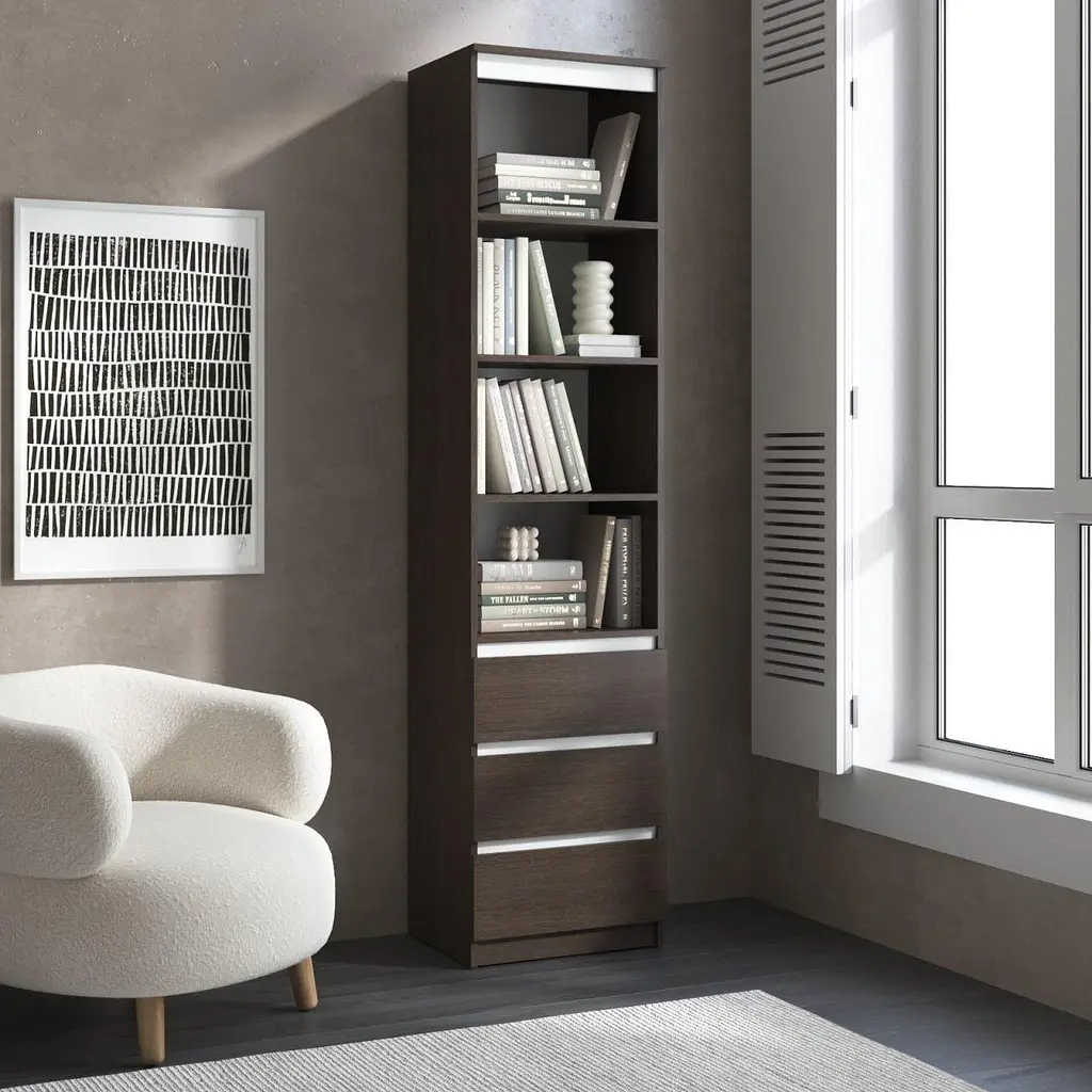 Пенал для книг Vays R-25 – стильный и функциональный мебельный элемент, который сочетает в себе открытые полки и удобные ящики без ручек. Изготовленный из качественного ЛДСП, он обеспечивает долговечность и устойчивость к ежедневному использованию. Размеры 50×40×211 см делают его идеальным выбором как для компактных комнат, так и для просторных интерьеров. Лаконичный дизайн гармонично впишется в современный, минималистичный или скандинавский стиль. Пенал подходит для хранения книг, декора, документов и личных вещей, станет практичным дополнением в гостиной, спальне или офисе.