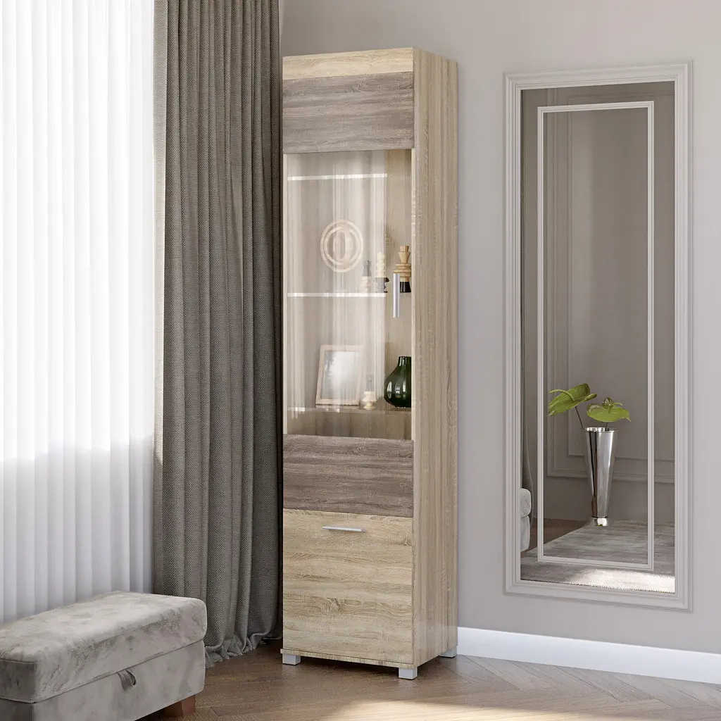 Пенал-витрина Британия-19 от украинского производителя Эверест - стильная и практичная мебель для обустройства спальни или прихожей. Комбинированный фасад с прозрачными вставками из стекла создают уют и индивидуальность помещения. За прозрачной дверцей можно хранить книги, хорошую посуду или предметы декора. Нижняя часть изделия оснащена дополнительным отделением с откидной дверцей. Компактные размеры позволяют разместить шкаф в любой комнате, предоставив полноценную систему хранения для большого количества вещей. Шкаф выполнен из экологически чистого ЛДСП (уровень эмиссии Е1) швейцарской компании Kronospan, поэтому подходит даже в детскую. Габариты пенала Британия-19 Эверест (Ш х Г х В) 50 х 38 х 208 см
