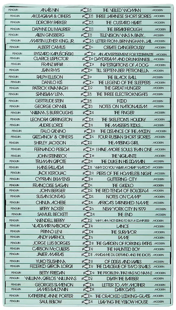 This box set of the 50 books in the new Penguin Modern series celebrates the pioneering spirit of the Penguin Modern Classics list and its iconic authors. Including avant-garde essays, radical polemics, newly translated poetry and great fiction, here are brilliant and diverse voices from across the globe. Ground-breaking and original in their day, their words still have the power to move, challenge and inspire.