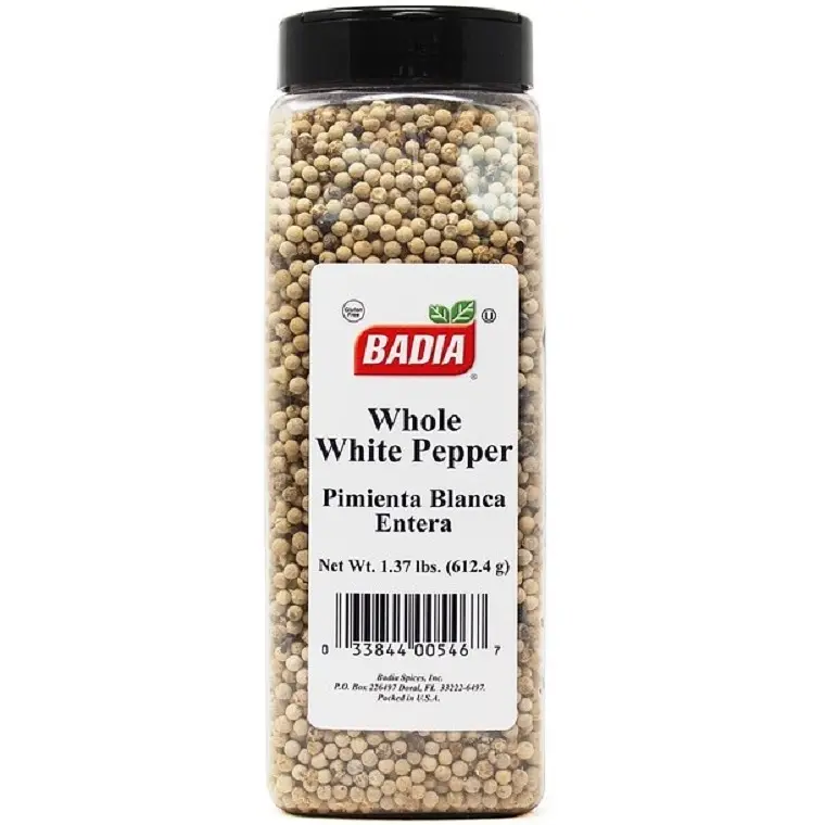 Перец белый Badia целый - это плоды того же растения, что и черный перец - Piper nigrum. По сравнению с черным перцем, белый имеет меньшую жгучость и более тонкий аромат. Белый перец подходит для более лёгких блюд. Перец хорошо сочетается с мясом и рыбой. Его советуют добавлять в соусы, бульоны, соусы, паштеты. Аромат вскрывается во время приготовления.