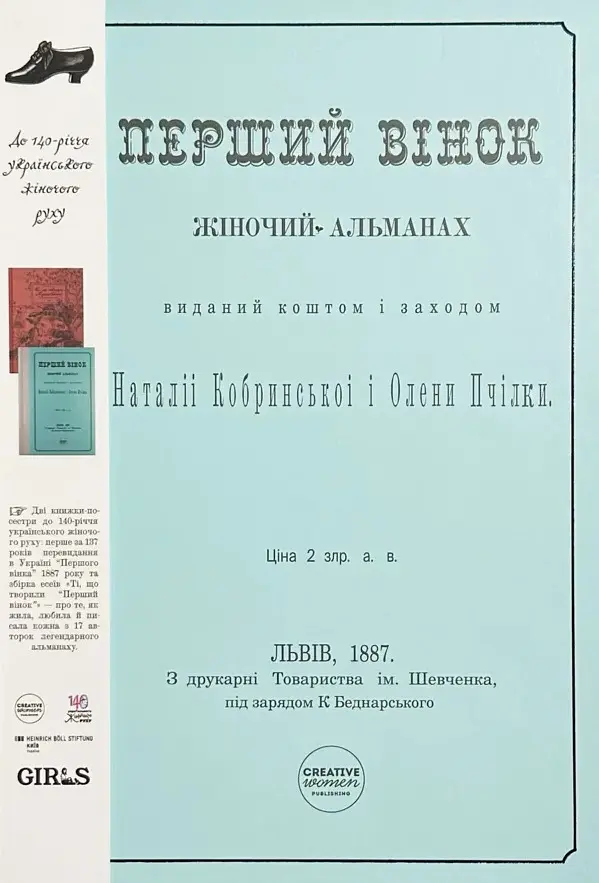 Женский альманах "Первый венок", напечатанный во Львове в 1887 году, имел тяжелую и длительную издательскую историю. Это издание навсегда вошло в историю украинского феминизма как беспрецедентный и достойный удивления пример интеллектуального, духовного, национального единения. Именно такая объединяющая идея издания - "В имени нашего национального единства" - была провозглашена в предисловии Наталии Кобринской к этому альманаху. Это было чрезвычайным событием в условиях безгосударственности Украины, тогда разделенной между двумя империями. Под одной обложкой альманаха сошлось 17 писательниц (11 - из Галичины и 6 - из Приднепровья), которые в целом представили в нем 49 произведений разного жанра (поэзия, проза, научные исследования). Проект реализуется при поддержке Фонда им. Генриха Белля, Бюро Киев - Украина и ОО "Девчата". Авторы: Наталья Кобринская, Леся Украинка, Елена Пчилка, Ульяна Кравченко, Людмила Старицкая, Ольга Франко, Днепровская Чайка, Анна Барвинок, София Окуневская, Климентина Попович, Ольга Левицкая, Екатерина Довбенчук, Анна Павлик, Сидора Навроцкая, Михайлина Рошкевич, Олеся Бажанская, Елена Грицай.
