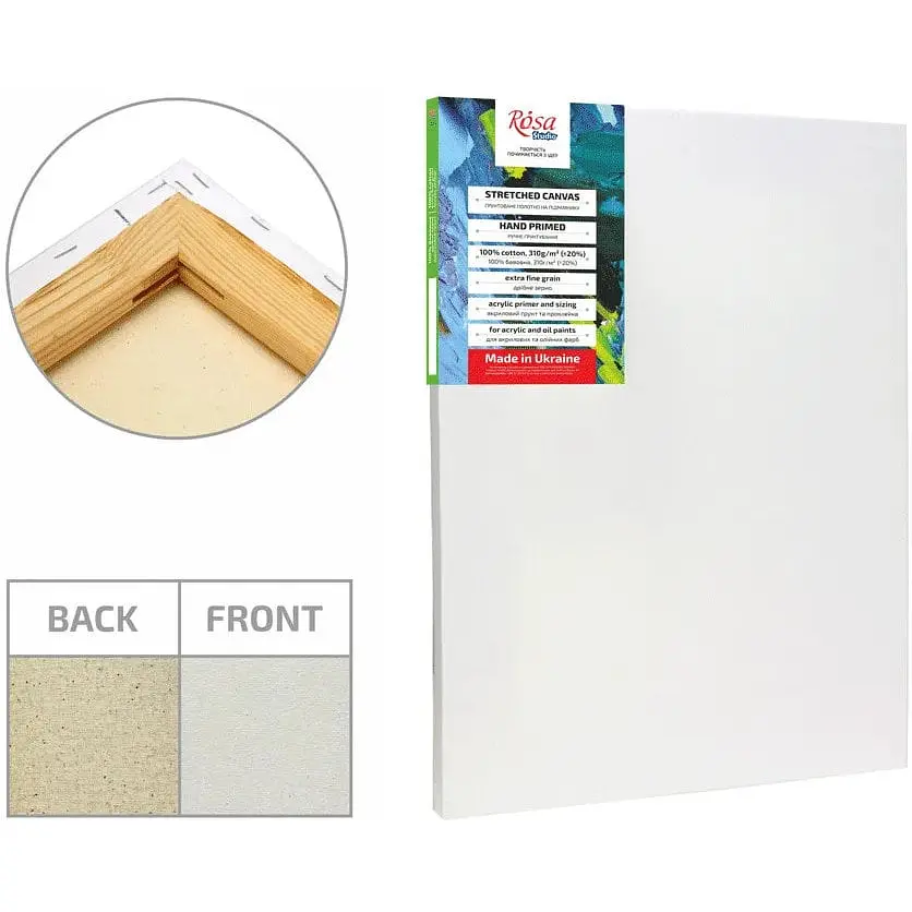 Полотно на подрамнике ROSA Studio - изготавливается по старинной технологии с соблюдением высочайших стандартов качества. 100% хлопок, мелкое зерно 310г/м² Универсальный акриловый грунт Эластичная проклейка Модульный подрамник (15х35) Галерейная натяжка Размеры от 15х15 до 60х80. Полотно хлопковое на подрамнике ROSA Studio - полноценная основа для живописи, которая вследствие использования утоньшенного модуля и меньшего количества слоев грунтовки является более привлекательной по цене. Это хороший вариант для учеников художественных школ, студентов, декораторов и художников-начинающих. Срок изготовления 1-3 рабочих дня. Наличие уточняйте у менеджера Не содержит вредных для здоровья веществ. Безопасен при использовании по назначению. Хранить при температуре от 5С до 25С и относительной влажности 55+5% Морозостойкий товар. Срок годности: неограниченный