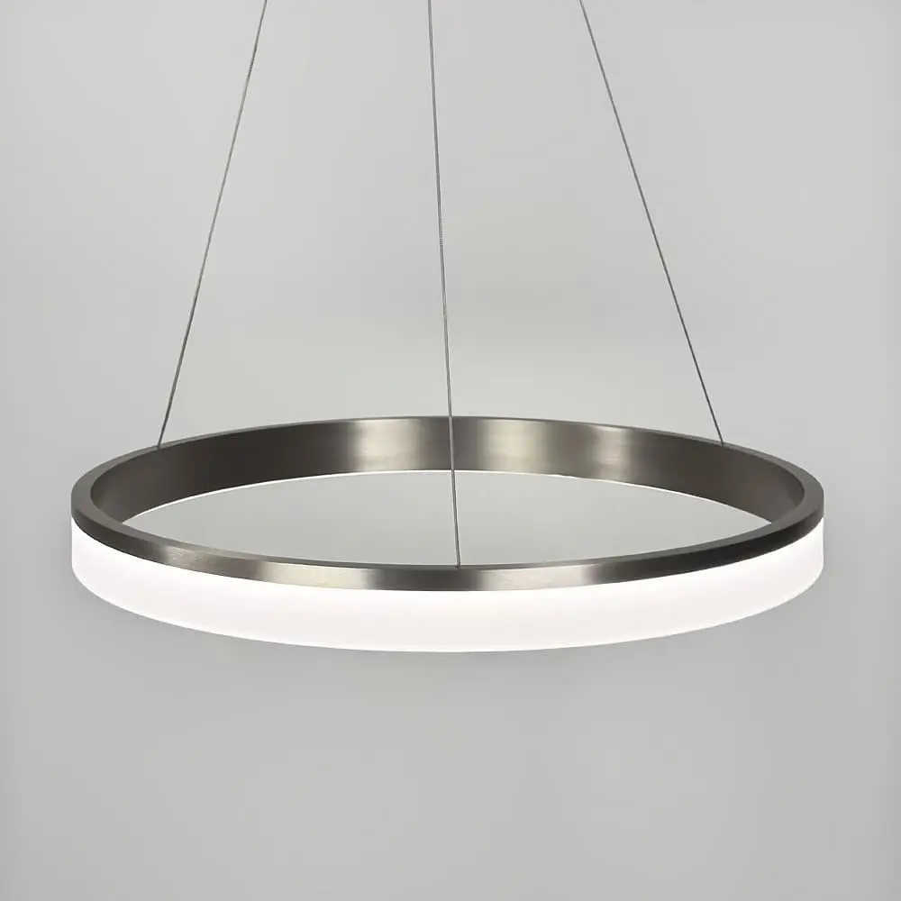 Современная кольцевая люстра в элегантном сатиновом цвете Carmine - стильное сочетание актуального дизайна и практичности. Благодаря плавным формам и минималистичному виду она прекрасно дополнит интерьеры в стиле модерн, скандинавский или лофт. Металлллическое кольцо дополнено элегантной акриловой вставкой по внешнему краю, за которой скрыты встроенные светодиоды с нейтральной температурой света, создающие мягкий рассеянный свет и подчеркивающий современный характер люстры. Люстра доступна в двух диаметрах - 60 и 80 см, высота корпуса составляет 6 см. Высота регулируется в пределах от 35 до 120 см, что позволяет установить светильник на нужной высоте в разных комнатах от гостиной до рабочего кабинета или холла. Эта люстра станет не только источником качественного освещения, но и стильным декоративным акцентом в современном интерьере. Количество источников света: 80 Серия: MJ262 Цвет основы: Сатин Материал плафона: Акрил Диаметр кольца: 80 см Размер потолочной основы: 21х4 см Цветовая температура: 4000K Максимальная высота: 120 см Минимальная высота: 35 см Материал основы: Металллл Размер монтажной планки: 17 см Тип крепления: Монтажная планка