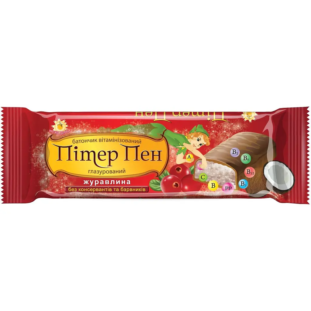 Батончик Питер Пен витаминизированный кокосовый в кондитерской глазури с клюквой может быть использован в рационах диетического питания для общего укрепления организма как дополнительный источник белков, жиров, углеводов, витаминов, макро- и микроэлементов.