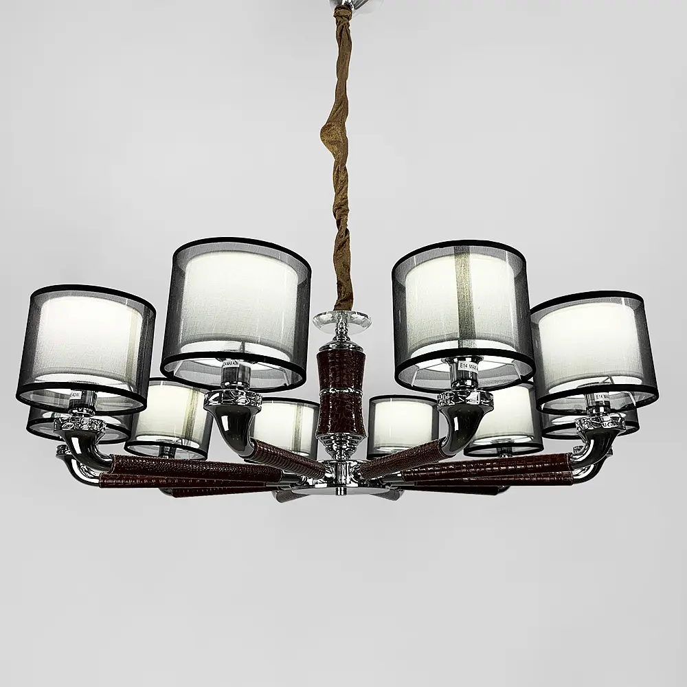 Невероятная плафонная люстра в металлическом цветовом корпусе хром с декором коричневой экокожи на рожках (рожки длиной 30 см) с цоколем Е14 на 10 ламп. Плафоны люстры размером 13х14 см. цвета графит. Общий диаметр люстры - 90 см. Крепится эта модель люстры на крючок и имеет регулировку высоты от 40 до 85 см. Тип цоколя: 90 Цвет основы: Хром Цвет плафона: Графит Цвет фурнитуры: Коричневий Размер потолочной основы: 7х12 см Максимальная высота: 85 см Минимальная высота: 40 см Размер плафона: 13х14 см Материал основы: Металллл Тип крепления: Крючок