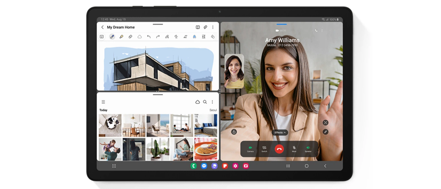 Выполняйте несколько задач одновременно. Galaxy Tab A9+ позволяет чертить архитектурные планы, просматривать изображения и общаться в видеочате одновременно с тремя приложениями на одном экране, не закрывая ни один из них.