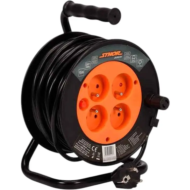 Удлинитель сетевой Sthor на катушке с 4 розетками и заземлением позволяет подключать несколько устройств одновременно. Благодаря заглушкам, защищающим от пыли и брызг, может использоваться как внутри помещений, так и вне их, например на строительных площадках, в саду, на производственных предприятиях.
