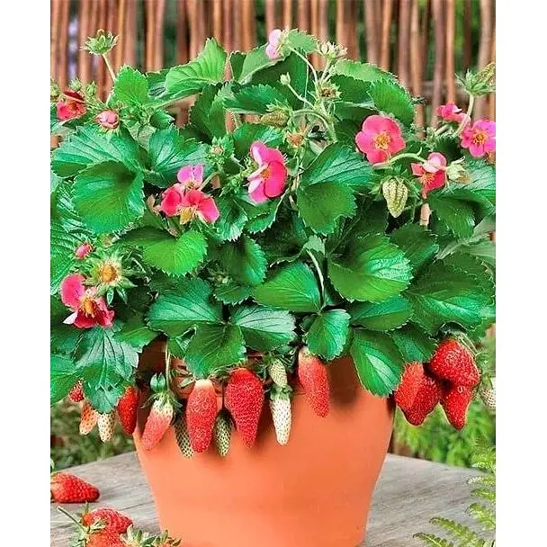 Клубника Ампельная "Розовая Панда" (Pink Panda) - это легкая в уходе декоративная земляника. Очень быстро размножается благодаря способности образовывать огромное количество усов. Растет на любых почвах, на солнце или полутени, быстро покрывая землю. Благодаря этим качествам популярна в озеленении клумбы. На 1м2 достаточно высадить 5 растений. В конце весны она представляет настоящее шоу из розовых цветов, цветущее без исключения весь вегетационный период с мая по ноябрь. Цветки ярко-розовые, серединка-ярко-желтая. Плоды не большие, но очень сладкие и ароматные. Плодоносит с конца мая и до морозов непрерывно. Листья насыщенно-зеленые, яркие, сочные. Прекрасный медонос, пчелы не пропустят розовые цветки почвопокровной земляники. Высокая морозостойкость. Не требовательна к условиям выращивания. В декоративных целях землянику можно использовать для оформления симпатичных ковриков разных размеров и форм. Их можно создавать, направляя усы в нужные места. Применяется декоративная земляника для оформления бордюров. Ее можно выращивать в подвесных контейнерах.